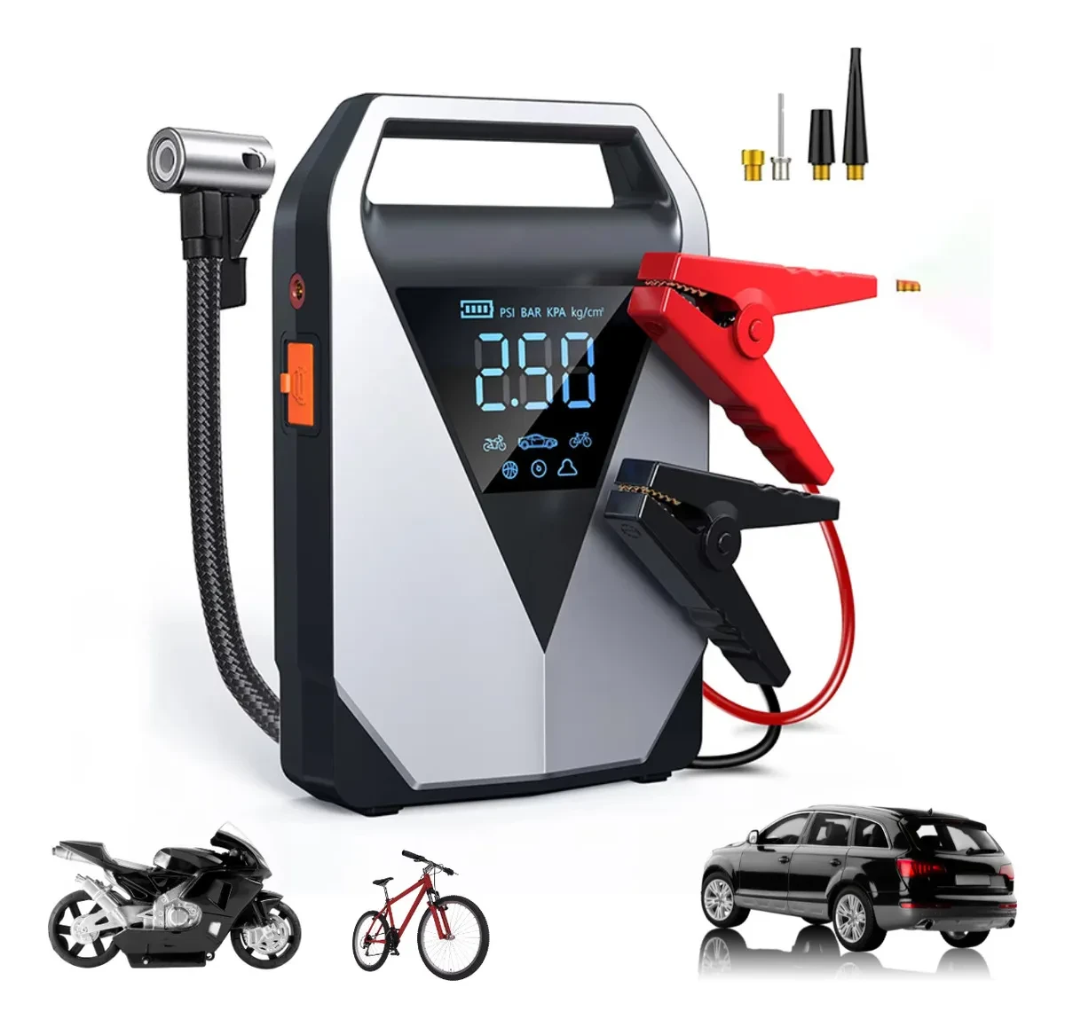 O Auxiliar Partida Boyu Cell 8000MAH é a solução completa para suas emergências. Com ele, você terá partida para carros e caminhonetes, carregamento rápido de dispositivos e um inflador de pneus embutido, tudo em um só aparelho. Não perca a oportunidade de comprar o seu e garantir a sua segurança!