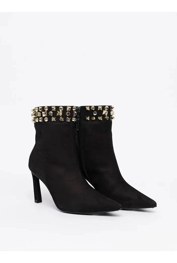 A Bota Couro Com Aplicações Lança Perfume se destaca pelas seguintes características principais: Bota de couro com aplicações, cano curto, salto alto estilo estilete, feita em camurça com bico redondo, zíper e tachas.