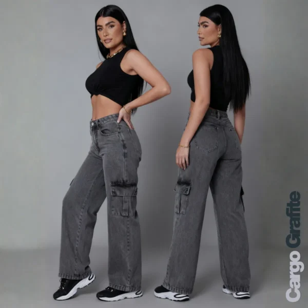 Calça Cargo Feminina Wide Leg Jeans Grafite: Conforto e Estilo em uma Só Peça