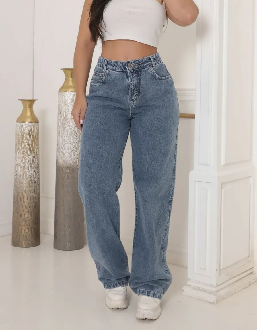 Com a nossa calça jeans wide leg feminina, você terá a liberdade de combinar diferentes looks, do casual ao sofisticado. Nossa calça oferece o caimento perfeito, valorizando a silhueta e proporcionando o conforto que você precisa para o dia a dia. Encontre a sua calça jeans com o melhor preço e compre agora!