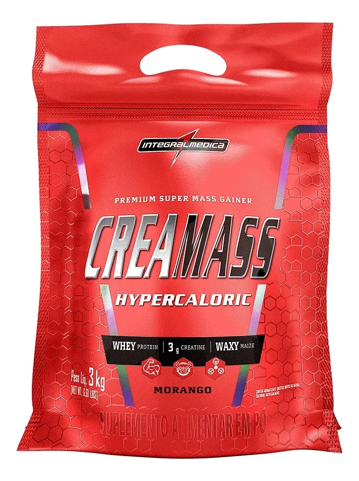 O Creamass Hipercalórico Pouch Morango 3kg Integralmédica se destaca pelas seguintes características principais: Carboidratos de rápida e lenta absorção, Proteínas de alto valor biológico (whey), 3g de creatina por porção, Sabor morango.