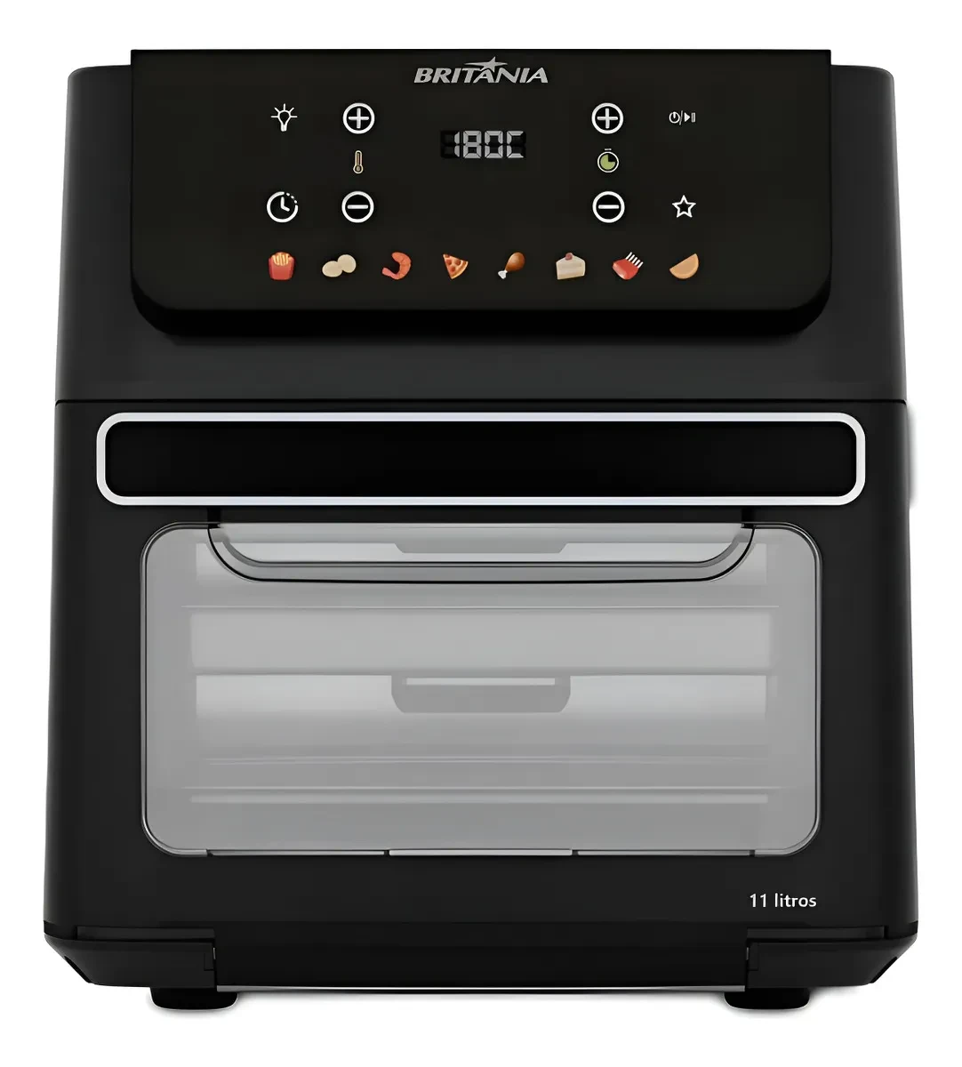 O Fritadeira Air Fryer Oven Britânia 11 se destaca pelas seguintes características principais: Marca Britânia, Linha Fritadeira, Modelo Oven, 11 litros de capacidade e 8 funções.