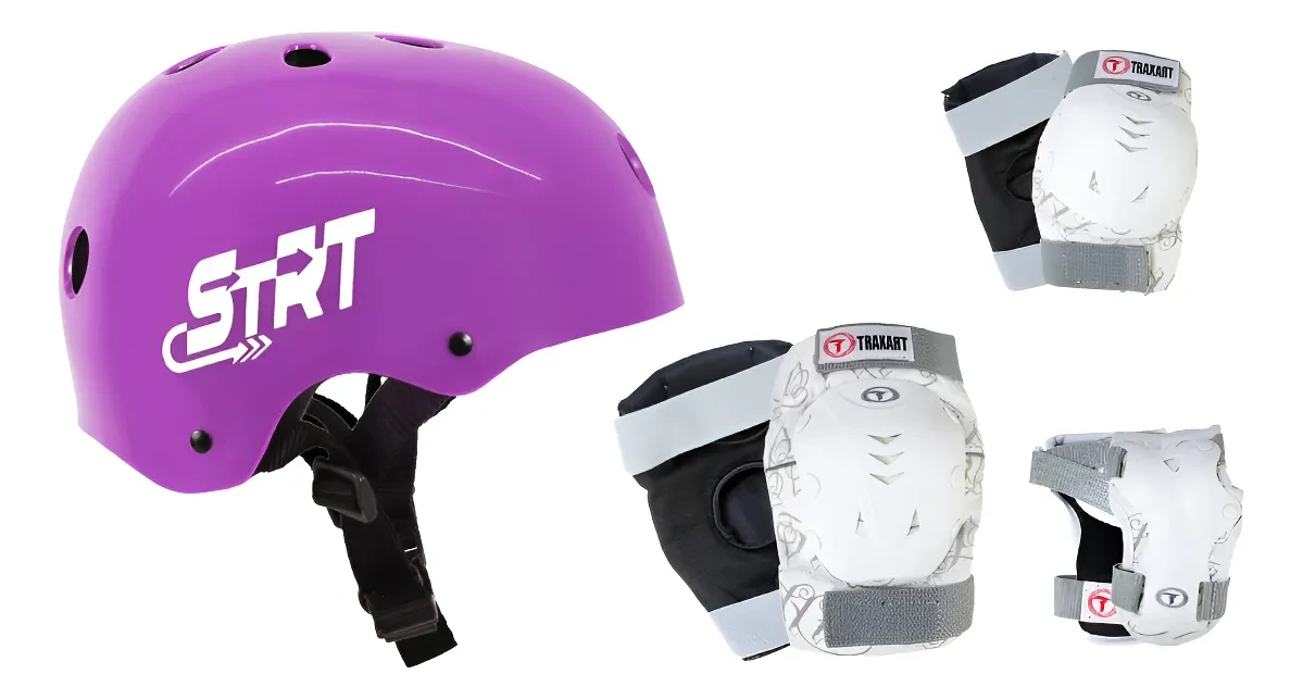 - Kit de proteção completo: joelheiras, cotoveleiras e munhequeiras.