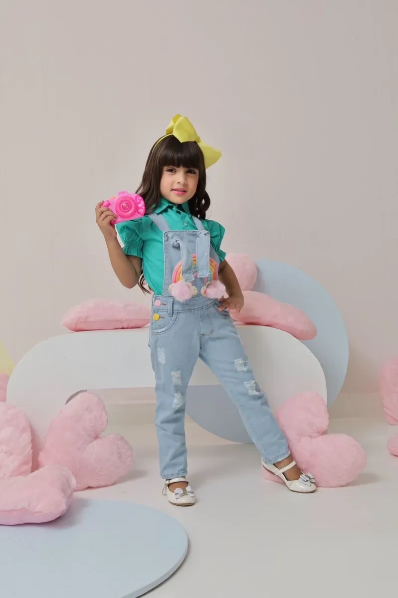 Macacão Jeans Infantil Mini Diva Pompom Destroyed Angio Boutique Kids – Oferta
