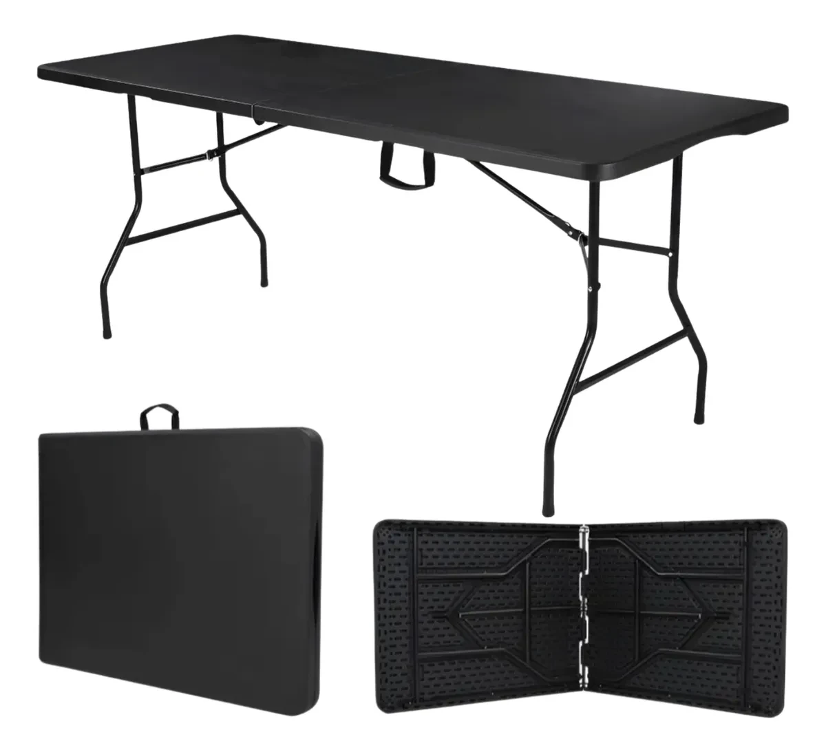 O Mesa Dobravel Camping 1.80m com Alça Jardim Preto se destaca pelas seguintes características principais: Mesa dobrável com capacidade para 8 pessoas, fácil de transportar, material resistente em aço e polietileno, cor preta e dimensões ideais de 1.8m.