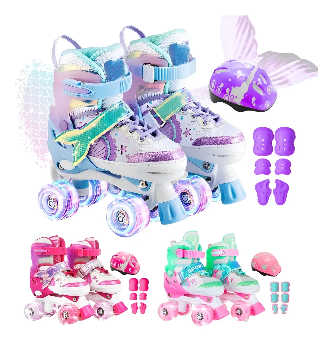 O Patins infantil CARLOS COMÉRCIO Sereia se destaca pelas seguintes características principais: Rodas com luzes de LED, Kit de proteção completo (capacete, joelheira, etc.), Ajustável e confortável.