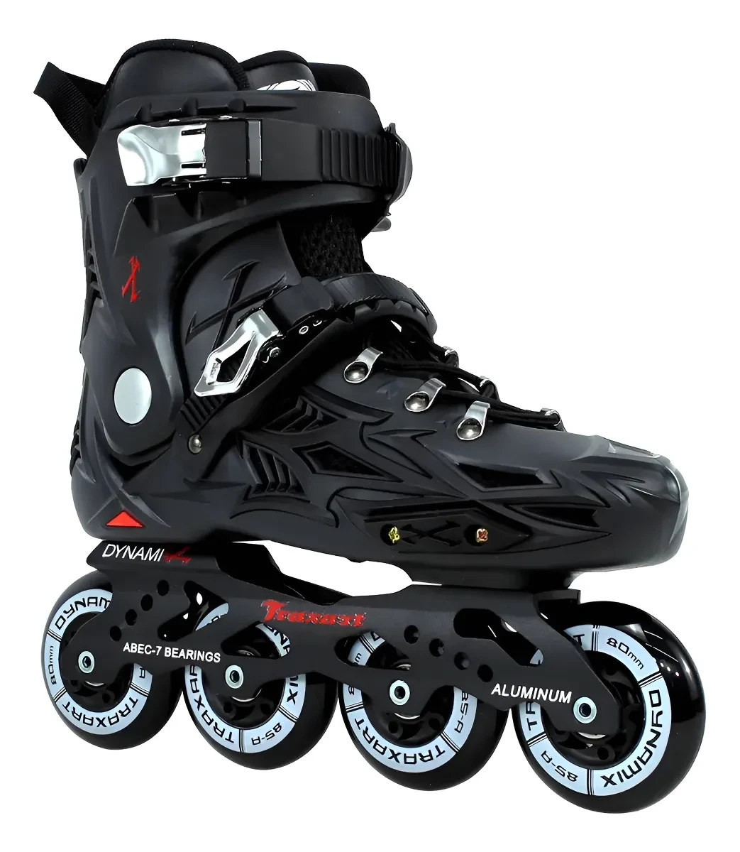 O Patins Traxart Dynamix se destaca pelas seguintes características principais: Chassis de alumínio reforçado, rodas de 80mm, rolamentos ABEC-7 e bota rígida com sistema de absorção de impacto.
