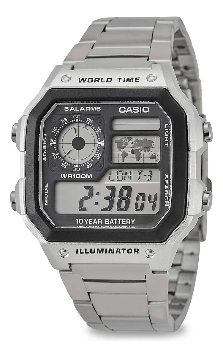 O Relógio Casio AE-1200 Masculino World Time Prata se destaca pelas seguintes características principais: Marca: Casio, Linha: Digital, Modelo: AE-1200, Modelo alfanumérico: AE1200WH-5AV, Gênero: Masculino, Idade: Adultos, Cor da correia: Prateado, Cor do bisel: Preto, Cor do fundo: Cinza, Cor da caixa: Prateado, Material da correia: Aço inoxidável, Cor do dial de horas: Preto, Cor do dial de minutos/segundos: Preto, Cor dos subdials: Cinza/Preto, Tipo de fecho: Dobrável, Peso: 91 g, Modelo detalhado: AE-1200WHD-1A, Tipo de movimento: Quartzo, Tipos de tela: Digital,