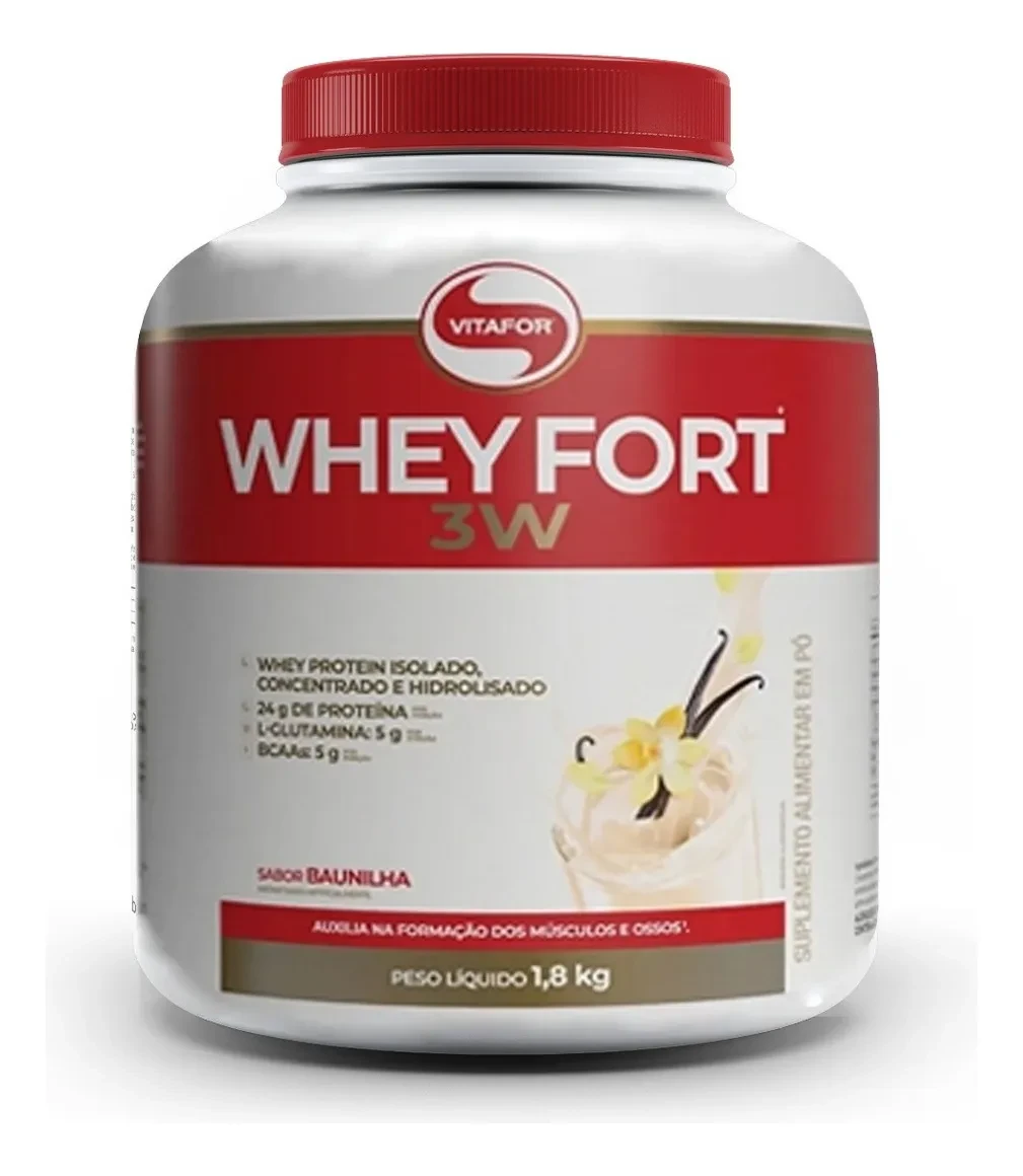 O Whey Protein Vitafor Whey Fort 3W 1800g Baunilha se destaca pelas seguintes características principais: Fonte de proteínas de alto valor biológico, que auxiliam na formação dos músculos e ossos; Perfil completo de aminoácidos, incluindo BCAAs, L-glutamina, L-arginina e L-prolina; Blend proteico com Whey Protein Isolado, Concentrado e Hidrolisado; 24g de proteína por porção.