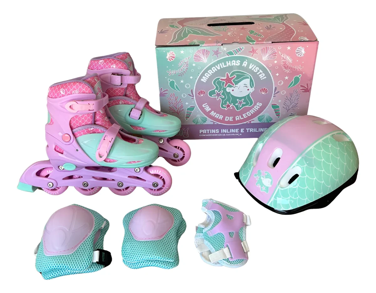 KIT COMPLETO: par de Patins, Capacete, par de Cotoveleiras, par de Joelheiras e par de Luvas de Proteção.