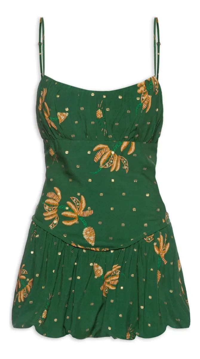 O vestido verde é confeccionado em tecido leve sem elasticidade. A peça justa no busto e solta no corpo possui decote U, alças finas com regulagem, recortes posteriores em lastex, recortes com franzidos nas partes posterior e frontal, mix de estampas em cores contrastantes, padronagem de poá em fios de lurex na cor dourado, comprimento curto e forro.